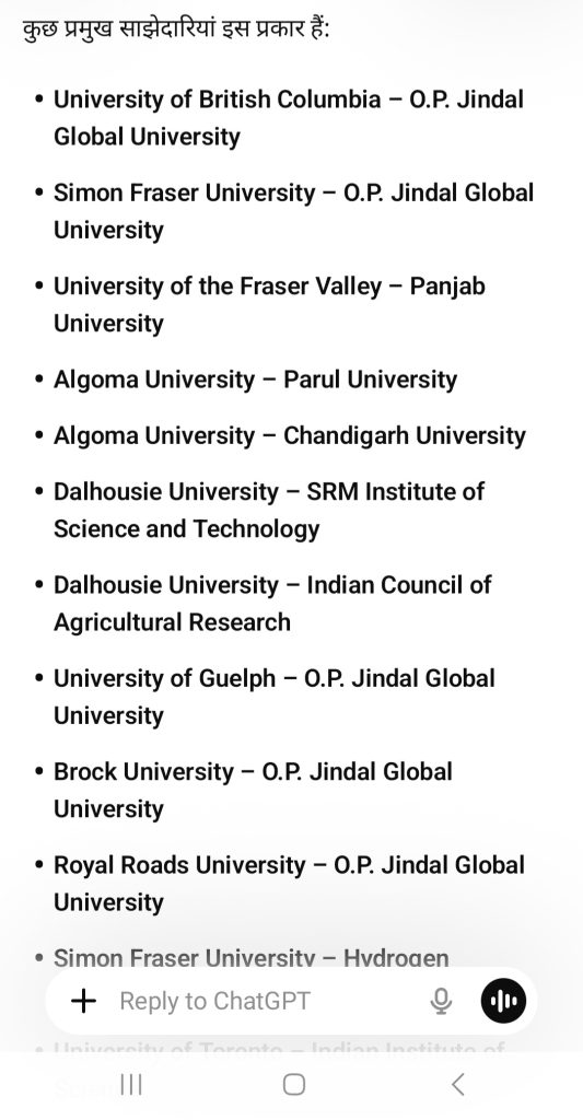 University of British Columbia – O.P. Jindal Global UniversitySimon Fraser University – O.P. Jindal Global UniversityUniversity of the Fraser Valley – Panjab UniversityAlgoma University – Parul UniversityAlgoma University – Chandigarh UniversityDalhousie University – SRM Institute of Science and TechnologyDalhousie University – Indian Council of Agricultural ResearchUniversity of Guelph – O.P. Jindal Global UniversityBrock University – O.P. Jindal Global UniversityRoyal Roads University – O.P. Jindal Global UniversitySimon Fraser University – Hydrogen Association of IndiaUniversity of Toronto – Indian Institute of ScienceUniversity of Toronto – Jio Institute