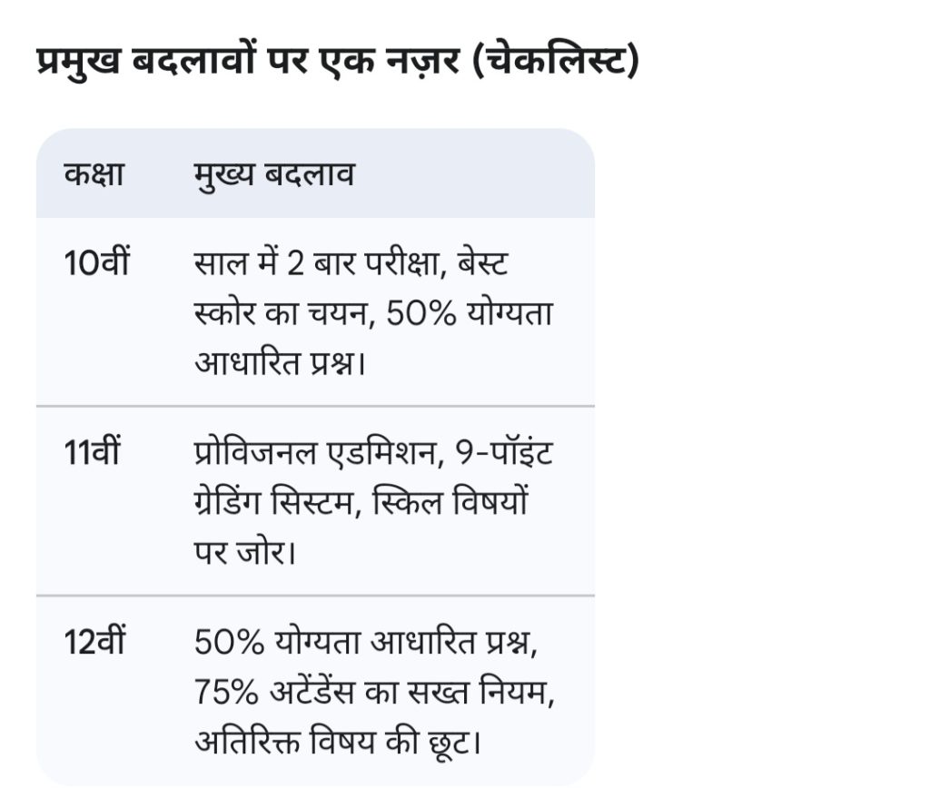 (10वीं और 12वीं)रटने की आदत को खत्म करने के लिए प्रश्न पत्रों के स्वरूप को बदला गया है:योग्यता आधारित प्रश्न (Competency-Based Questions): अब प्रश्न पत्र में 50% सवाल केस स्टडी, सोर्स आधारित और एप्लाइड नॉलेज पर होंगे।बहुविकल्पीय प्रश्न (MCQs): वस्तुनिष्ठ प्रश्नों का वेटेज बढ़ाकर 20% कर दिया गया है।लघु/दीर्घ उत्तरीय प्रश्न: इनका हिस्सा घटाकर अब केवल 30% रह गया है।