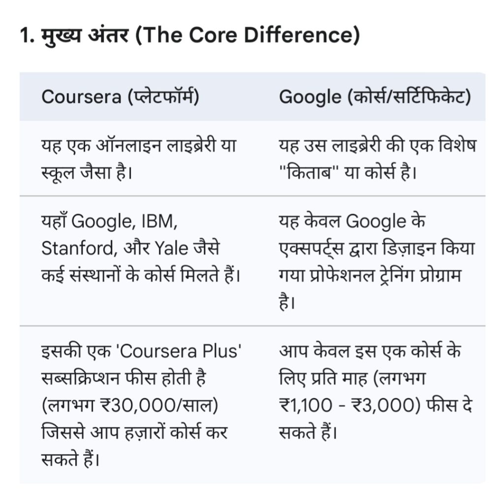 G-INews, KANPUR : यह समझना ज़रूरी है कि Coursera और Google प्रतिद्वंदी (rivals) नहीं हैं, बल्कि वे एक-दूसरे के पार्टनर हैं। गूगल अपना कोर्स बनाने वाला (Content Provider) है और कोर्सेरा वह प्लेटफॉर्म (Host) है जहाँ यह कोर्स उपलब्ध है। इसलिए दोनों सर्टिफिकेट कोर्स महत्वपूर्ण है लेकिन ​फिर भी, अगर हम प्लेटफॉर्म और कोर्स के नजरिए से इनकी तुलना करें, तो मुख्य अंतर नीचे दिए गए हैं: