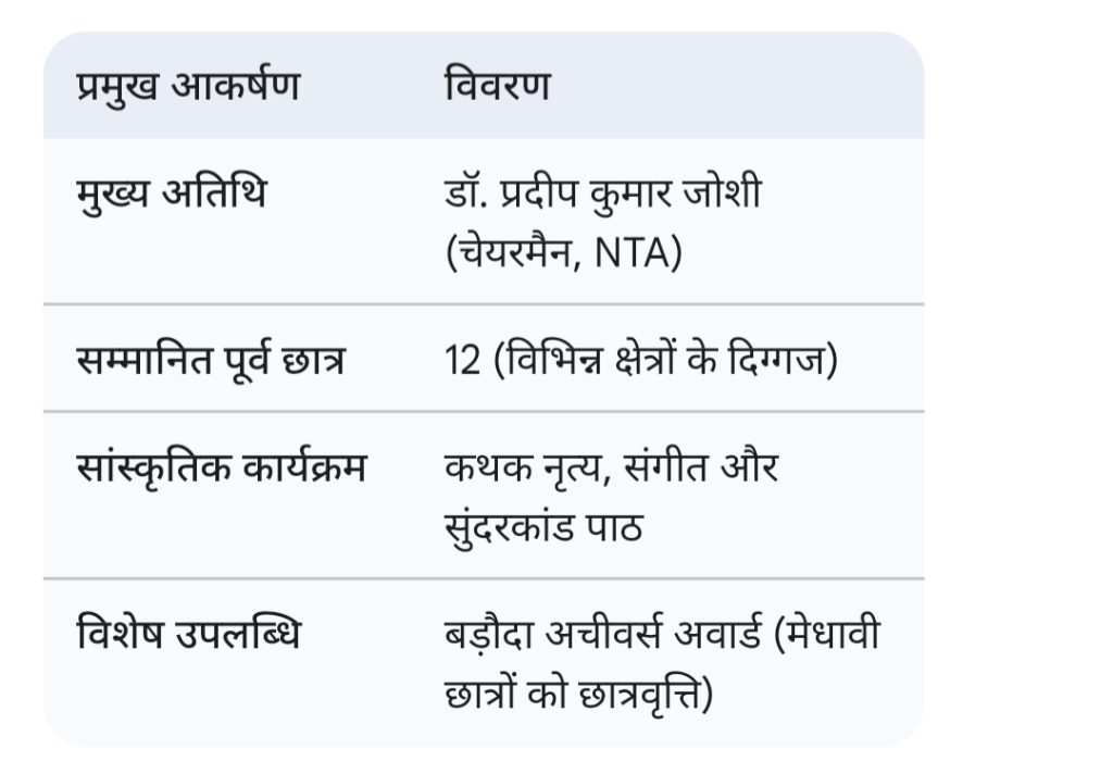 स्थापना दिवस के अवसर पर शिक्षा, प्रशासन, चिकित्सा और लेखा जैसे क्षेत्रों में नाम रोशन करने वाले 12 पूर्व छात्रों को सम्मानित किया गया। कार्यक्रम की अन्य मुख्य विशेषताएं रहीं: