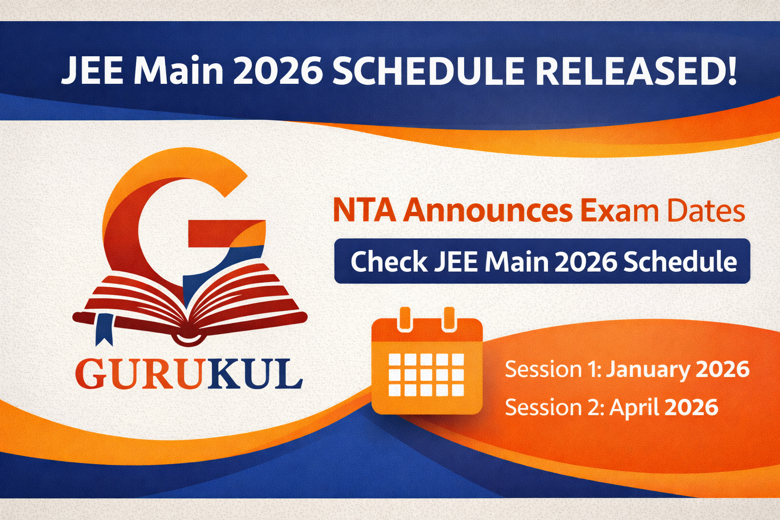 G-INews New Delhi: नेशनल टेस्टिंग एजेंसी (NTA) ने देश की सबसे बड़ी इंजीनियरिंग प्रवेश परीक्षा JEE Main 2026 का आधिकारिक शेड्यूल जारी कर दिया है। परीक्षा की तारीखों के ऐलान के साथ ही लाखों छात्रों का इंतजार खत्म हो गया है। जेईई मेन परीक्षा दो सत्रों में आयोजित की जाएगी – सेशन 1 (जनवरी) और सेशन 2 (अप्रैल)।